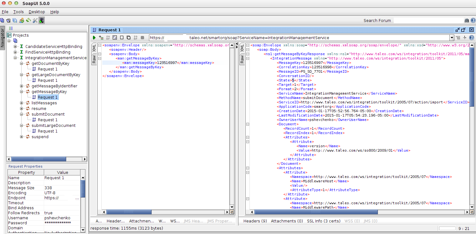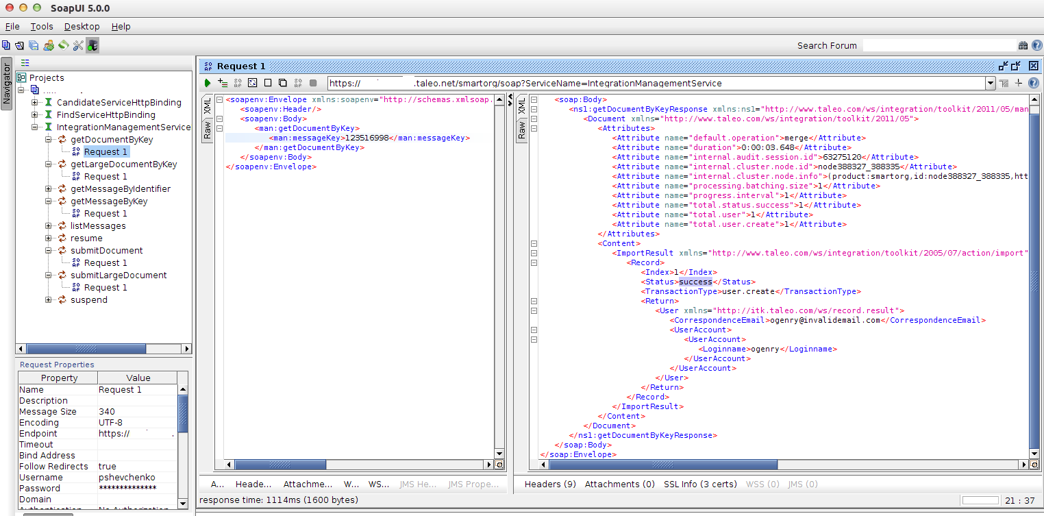 In this section, I will illustrate how to use Bulk API import operation. In my scenario I would like to create Taleo user account from external identity system. I will use the following operations: submitDocument(), getMessageByKey(), getDocumentByKey(). Probably in production environment we should use submitLargeDocument() and getLargeDocumentByKey() which designed to handle large documents (over 50K) and should have MTOM setting enabled.