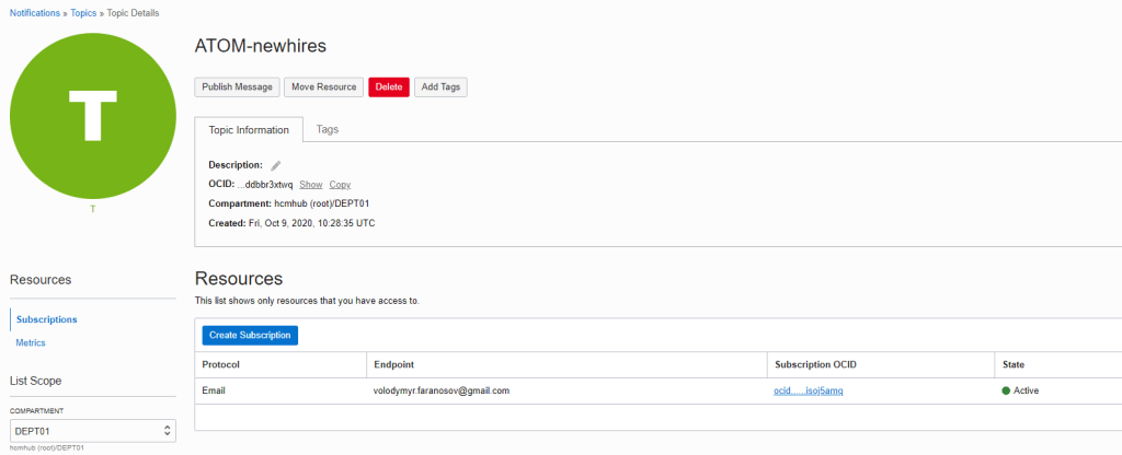 Once it finds new events it calls the oci_notification function that invokes OCI rest service to publish message to the specific topic. It was a bit challenging to figure out how to sign Oracle Cloud Infrastructure API requests. It is described here.