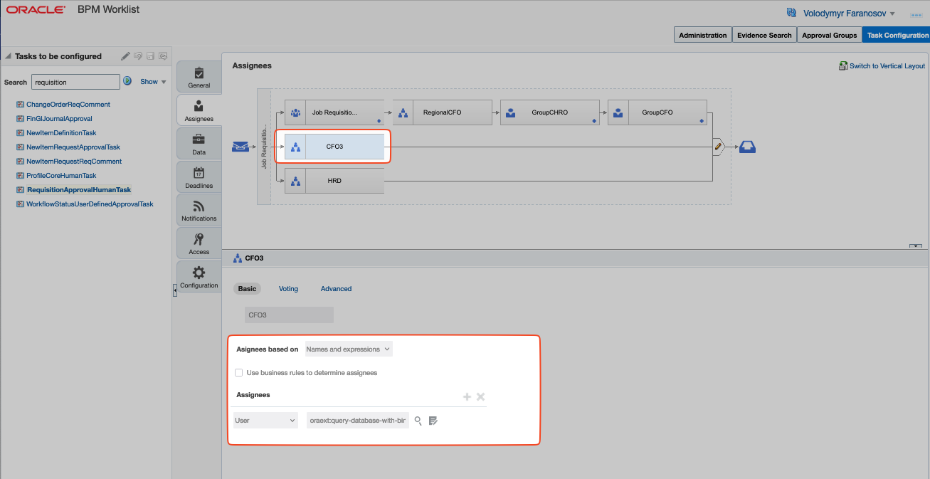 Let me explain this workaround in detail. It is based on the ability to use the “Assignee based on: Names and expressions” option in BPM (Inspired by How to use query-database-with-bindvar in Human Task(to Avoid Hard Parsing Issues) (Doc ID 2975400.1))