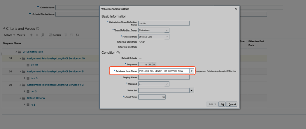 In this instance, we have utilized a database item that retrieves the number of years of length of seniority. This feature allows the rate to be calculated dynamically, which is a highly beneficial capability.